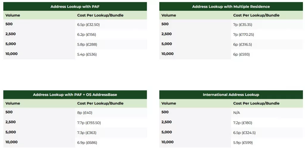 - UK PAF + OS AddressBase – An up-to-date database with information on addresses, properties, and land with prices starting at 8p per lookup.