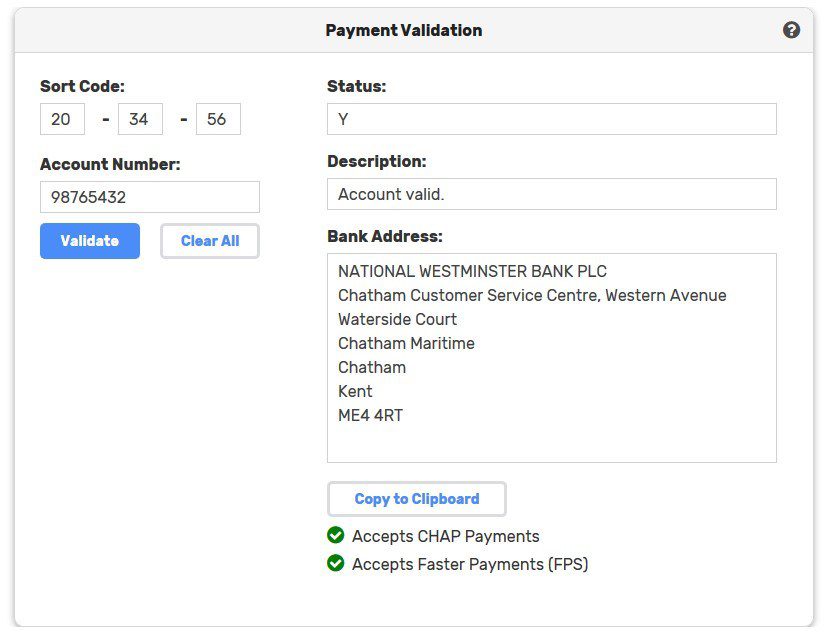 Once a sort code and account number is given, the ‘Validate’ button will be enabled. When clicked, the validation status, bank address and supported payment methods will be displayed. If a bank address is returned, the ‘Copy To Clipboard’ button will be enabled.