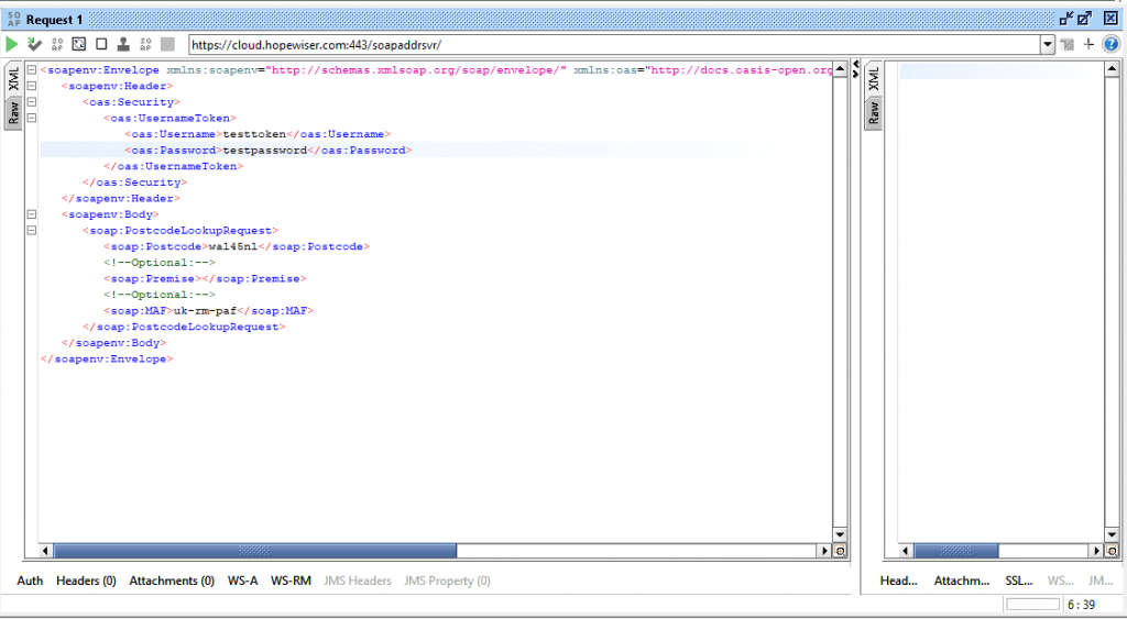To perform a simple postcode lookup, expand the PostcodeLookup node in the project navigator and double-click on Request 1. Replace the ? placeholders for the Username, Password, Postcode (Premise too in refining the Postcode search results if you wish) and MAF. Remove all other options.