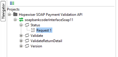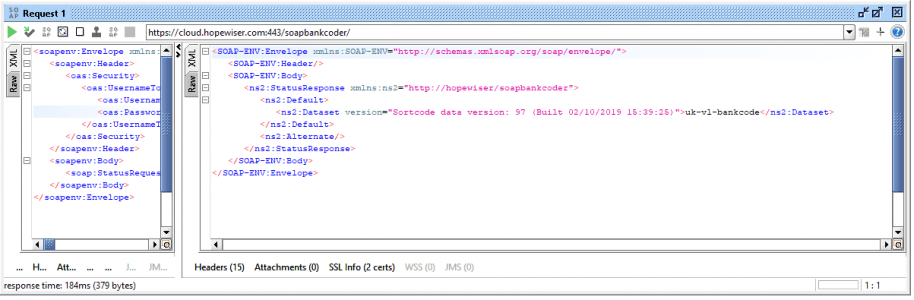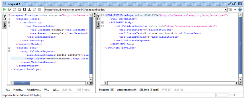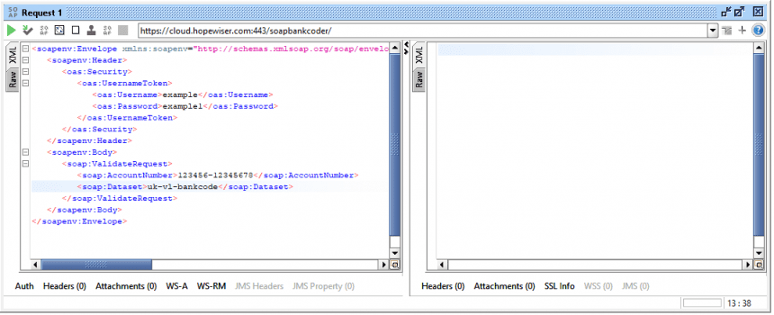 To validate a bank account number, expand the Validate node in the project navigator and double-click on Request 1. Replace the ? placeholders for the Username, Password, AccountNumber (full account number preceded by the sort code) and Dataset.